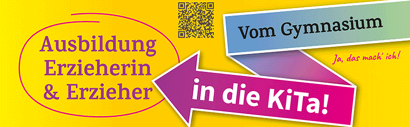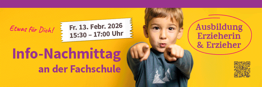 Die Ausbildung zur Erzieherin und zum Erzieher beginnt immer im September. Wir nehmen noch Bewerbungen für Restplätze im Schuljahr 2026/27 entgegen: fürs Berufskolleg, für den Quereinstieg in den Unterkurs, für die praxisintegriere PiA-Ausbildung und für die Teilzeit-Ausbildung. Übrigens: Wir haben WG-Zimmer für auswärtige Schülerinnen und Schüler.
