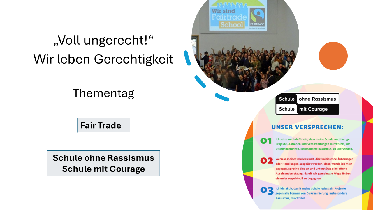 Am 30.01. hatten wir einen vielseitigen Thementag zu unseren Profilen als Fair-Trade-Schule und Schule ohne Rassismus. Die ganze Schulgemeinschaft war engagiert, lebendig, nachdenklich, fröhlich im gemeinsamen Tun. In der Aula stimmten wir uns auf das Gesamtthema ein: „Voll ungerecht: Wir leben Gerechtigkeit“ – mit Akzenten wie dem Song „tausend Farben“, einem Clip zur Zivilcourage, gespielten Kurszenen zur Diskriminierung, dem Film „Afro“ und Rhythmen zu „Mensch bleibt Mensch“.