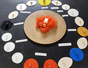 Wir erlebten die 18 Perlen mit ihren verschiedenen Größen, Farben und Materialien durch Meditation, in Texten, durch Gesang und Bewegung und im Gespräch. Die Perlen sind Symbole für zwei Lebensbewegungen: für den Weg Jesu und für den eigenen Glaubens- und Lebensweg. Interessant, dass die kleinen länglichen Perlen der Stille, die zwischen den thematischen Perlen zum Innehalten einladen, in ähnlicher Weise als Zwischenperlen auch in der Gebetskette des Islams, der Misbaha, vorkommen. Darauf machte uns eine muslimische Studierende aufmerksam.