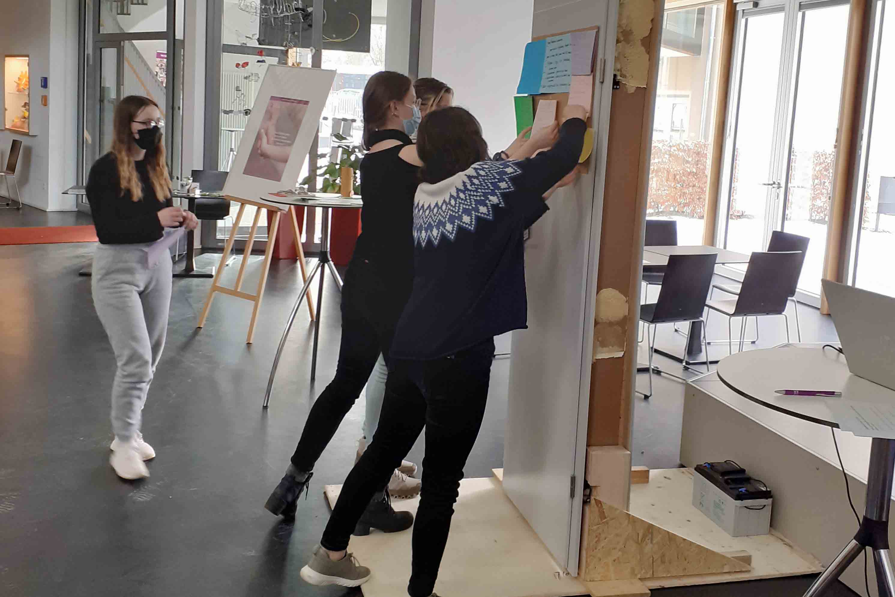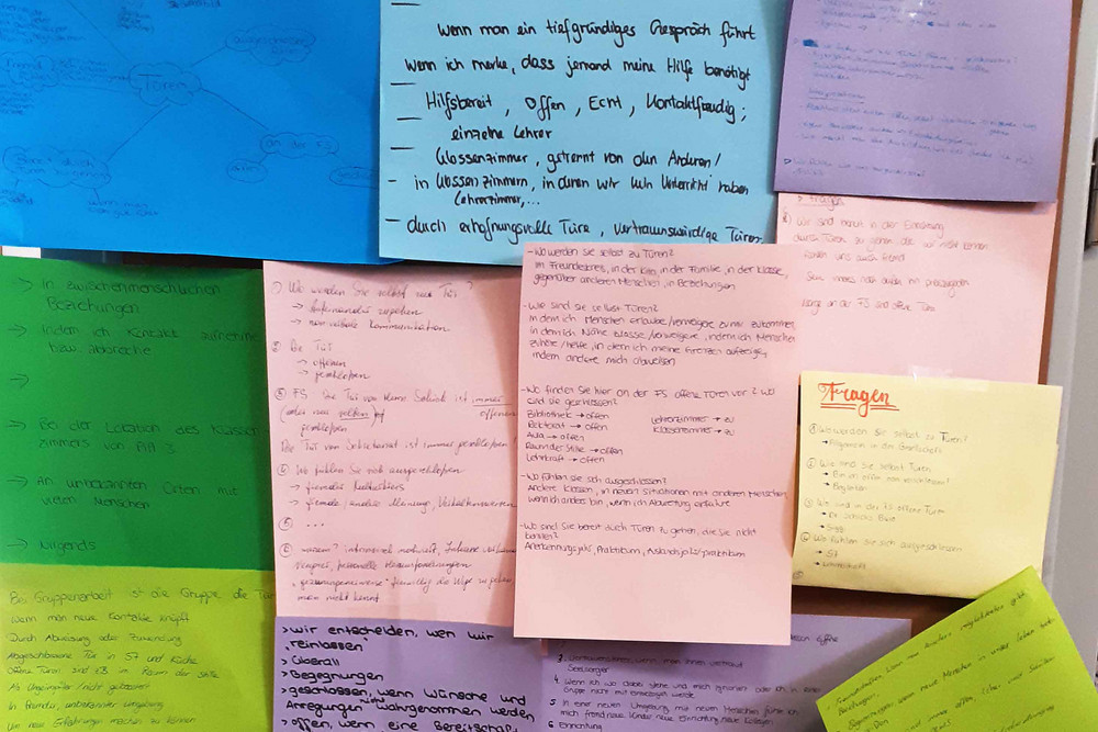 Ein kurzer Clip des bayerischen Bischofs Heinrich Bedford-Strohm, Blitzlichter zum biblischen Kontext und das Video zum Song „Bei dir finden“ von Weida & Mohns führten ins Thema ein. Eine echte Tür zum Öffnen und Schließen, die Hausmeister Siegmar Bosch in der Aula aufgestellt hatte und die der Ort eines kurzen Anspiels war, gab der regen Gruppenarbeit der Studierenden die Inspiration. Fragen, die thematisch wurden, waren: Wo und wie werden Sie selbst zu Türen? Wo finden Sie hier an der Fachschule offene Türen vor? Wo sind sie geschlossen? Wo fühlen Sie sich ausgeschlossen? Wo fühlen Sie sich fremd? Wieso? Wo sind Sie bereit durch Türen zu gehen, die Sie nicht kennen? Die Antworten waren facettenreich und die vorbehaltlose Offenheit Jesu fächerte sich dabei auf in viele kleine Offenheiten des Alltags.