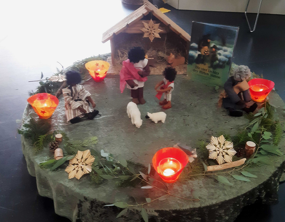 Zum andern stellte Petra Reiss das Bilderbuch „Die vier Lichter des Hirten Simon“ von Gerda Marie Scheidl vor. Dabei verknüpfte sie das Vorlesen und Präsentieren der Bilder mit der Gestaltung durch biblische Erzählfiguren in einer weihnachtlichen Szenerie. Auf diese Weise wurde die Geschichte noch anschaulicher und bot Raum zum Verweilen. Die Botschaft vom Licht, das im Weiterschenken umso kräftiger leuchtet, wurde durch Worte, Bilder und Spiel erlebbar.