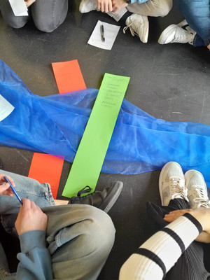 Den Fokus auf die Verbundenheit gewannen wir mit einer Aktion zum Thema „Ich und die da drüben“. Ein Fluss aus blauen Tüchern ließ zwei Ufer mit zwei Gruppen entstehen. Auf jeder Flussseite gab es einen Austausch. Zum einen über das, was Gruppen verbindet: „Wir sind hier! Was hält uns zusammen?“ Antworten waren zum Beispiel: „gleiche Interessen“, „Lebenserfahrung“, „gemeinsame Werte“, „ähnlicher Humor“, „religiöse Zugehörigkeit“. Zum andern kam der Blick auf das, was Gruppen trennt: „Die da drüben: Was steht zwischen uns?“ Antworten hier: „Charaktereigenschaften“, „andere Lebensweise“, „Konflikte“, „Vorurteile“, „politische Gegensätze“, „Raucher versus Nichtraucher“.