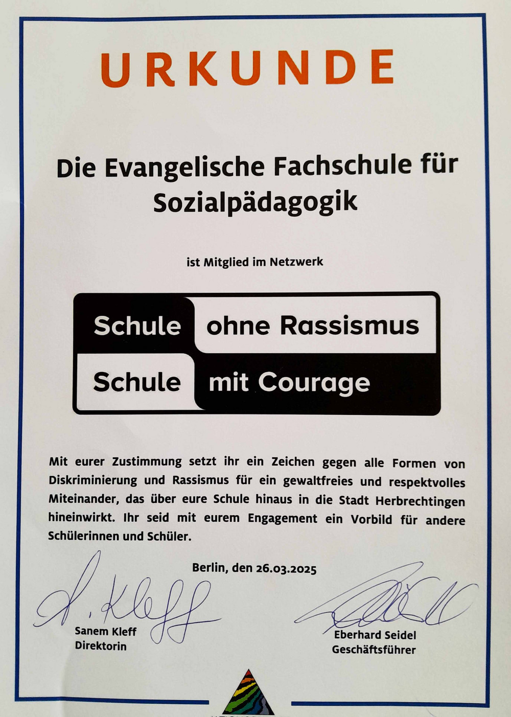 In einer feierlichen Auftaktveranstaltung wurde die Evangelische Fachschule Herbrechtingen im März 2025 ins Netzwerk der Courage-Schulen aufgenommen. Unser friedenspädagogisches Profil mit unserem Einsatz für die Würde jedes Menschen und für ein gerechtes Zusammenleben hat dadurch neue, stärkende Inspirationen bekommen. Der Landesvertreter der Courage-Schulen Baden-Württemberg, Dr. Niels Joeres, überreichte uns die Urkunde der Mitgliedschaft im Netzwerk. Darin steht: „Mit eurer Zustimmung setzt ihr ein Zeichen gegen alle Formen von Diskriminierung und Rassismus für ein gewaltfreies und respektvolles Miteinander, das über eure Schule hinaus in die Stadt Herbrechtingen hineinwirkt. Ihr seid mit eurem Engagement ein Vorbild für andere Schülerinnen und Schüler.“
