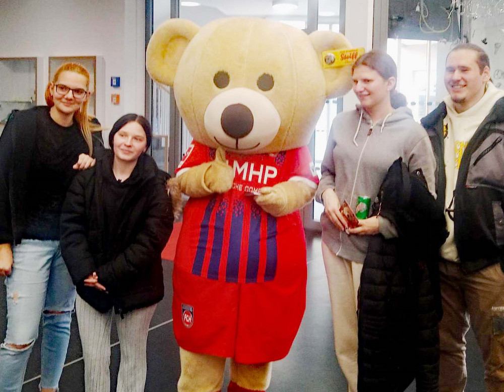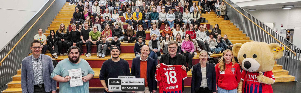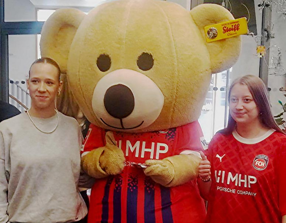 Eine echte Besonderheit ist der Pate unserer Courage-Schule: Der Fußballbundesligist 1. FC Heidenheim. Maskottchen Paule und die Vereinsmitarbeiterin Larissa Laisle wurden begeistert begrüßt. Letztere betonte, wie wichtig dem Verein die Ablehnung jeglicher Form von Gewalt und Diskriminierung sowie die Gleichbehandlung aller Menschen ist und welche Bedeutung diese Werte auch für das Fußballteam haben. Sie zeigte sich sehr erfreut, als FCH Pate unserer Schule sein zu können. Ein Trikot mit den Unterschriften aller FCH-Profis war eine schöne Dreingabe. Auch die Heidenheimer Zeitung hat über diesen inspirierenden Nachmittag berichtet.